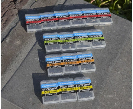 These Stickshots will help you to easily setup each float. Selecting the right lead is very easy thanks to the indication in weight instead of numbers. The right softness and the perfectly centered cut ensure that Stickshots are easy to fix on both thin and thicker lines without damaging them. The elongated shape provides extra grip on the line, so they do not or hardly move while fishing. The slim shape provides a gradual and very natural way of sinking. All this makes Stickshots very suitable for traditional coarse fishing and carp fishing. Stickshots are available in 16 different sizes from 0.02 to 1.0gr, so that an optimal lead setting can always be achieved.