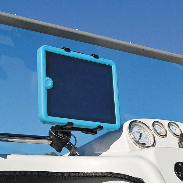 Nowadays, map plotter, buzzer and even radar output can be read on tablets. The ScreenGrabba holds your iPad, Galaxy Tab or other touchscreens securely even when in a waterproof bag or case. The holder allows 360° horizontal rotation, landscape to portrait adjustment and more than 90° tilt. The Screengrabba is suitable for 7″ – 10″ tablets (max. height 10″) and can easily be adjusted from landscape to portrait using R-Lock lockable joints.