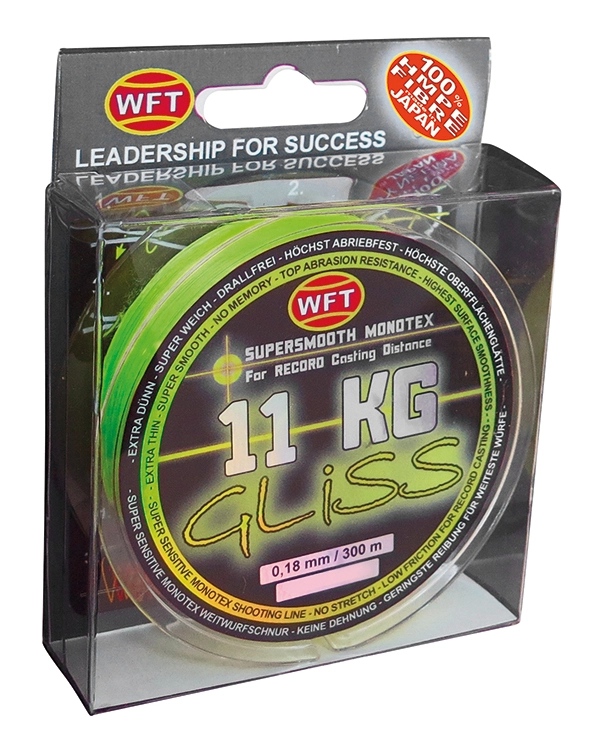 WFT Gliss is an all new fishing line from WFT. In terms of properties very similar to a monofilament line. Gliss, however, has four times the max pull of conventional monofilament! The surface of the Gliss is very smooth and round and lies perfectly on the reel. The casting distance you can achieve with this line is significantly greater than with conventional fishing lines and after each cast the line winds up perfectly. WFT Gliss offers tremendous strength, high abrasion resistance and extreme flexibility for the longest casts.
